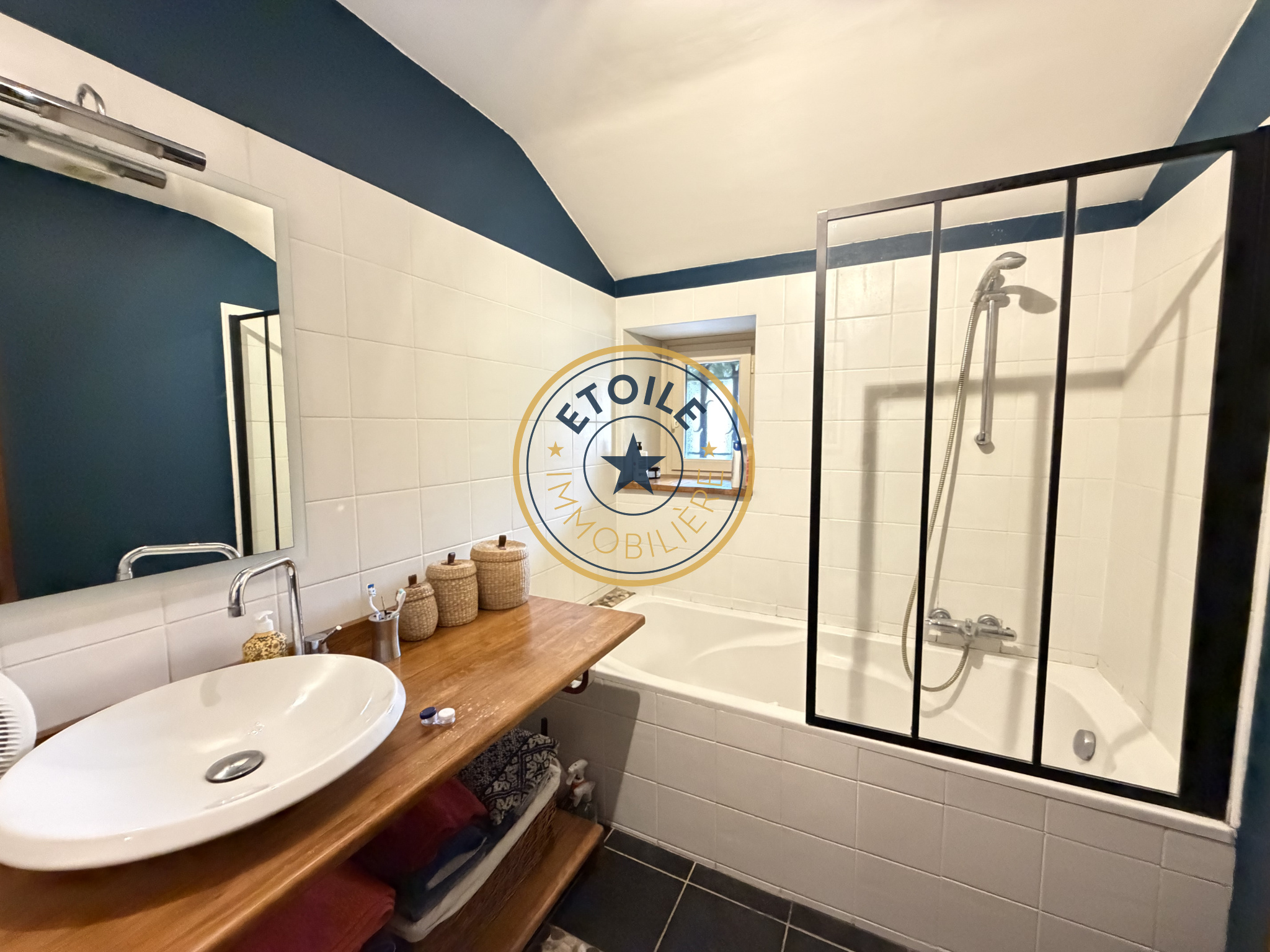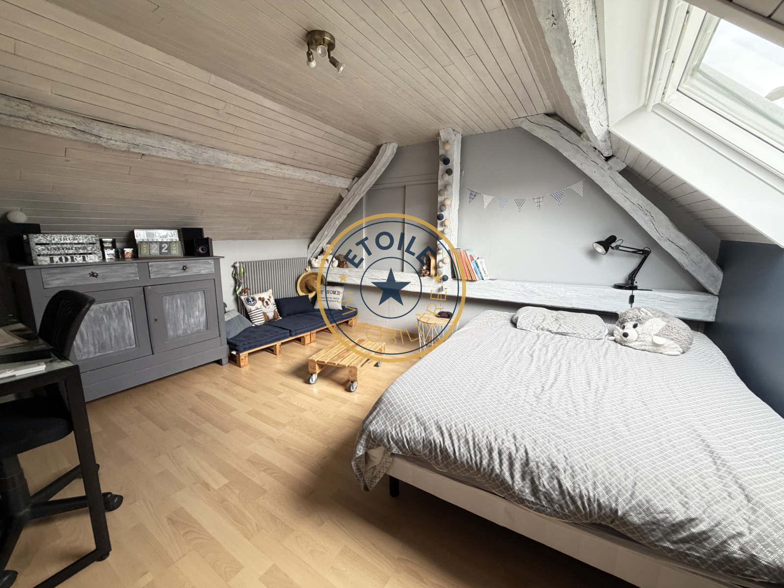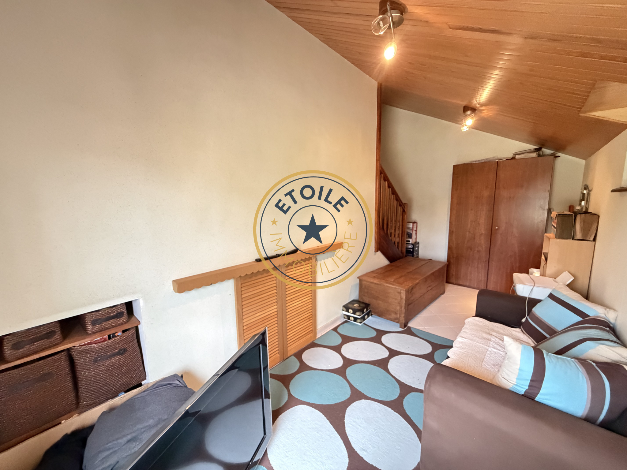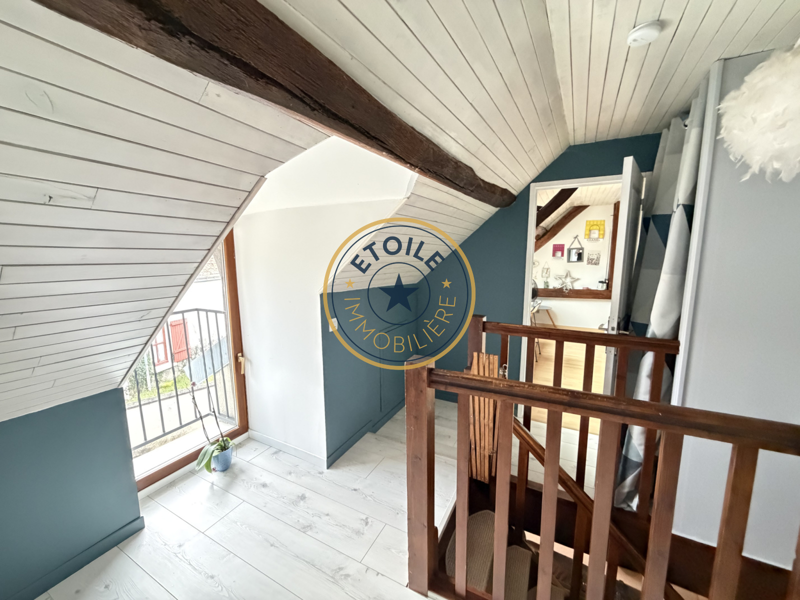A l'étage, un palier dessert deux grandes chambres mansardées avec placards et une salle d'eau avec WC.