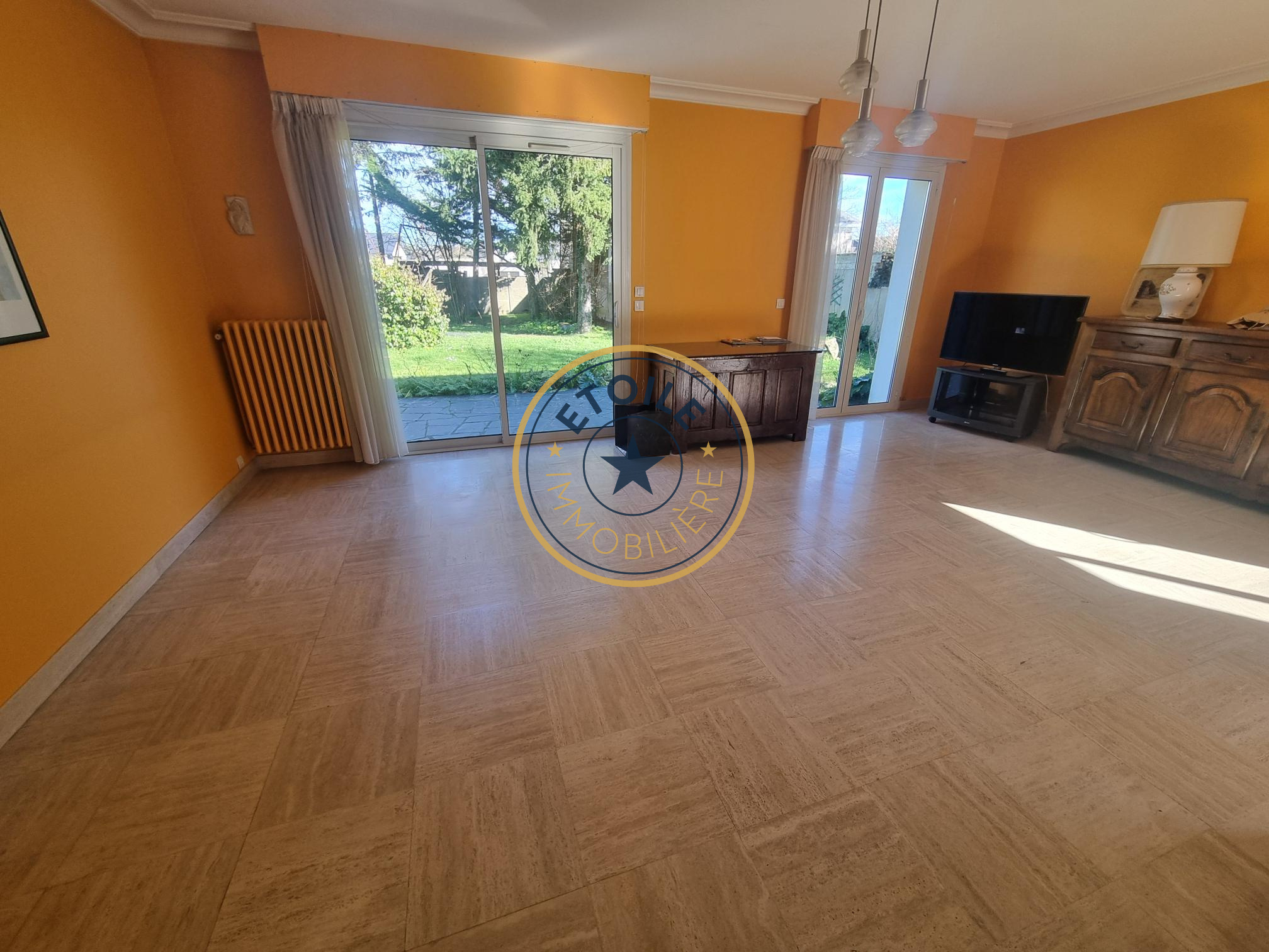 Le vaste salon-séjour baigné de lumière accède directement à la terrasse ardoisée et ensoleillée, et à la cuisine actuellement indépendante. Celle-ci peut s'ouvrir sur la salle à manger si vous aimez les grands espaces ouverts.